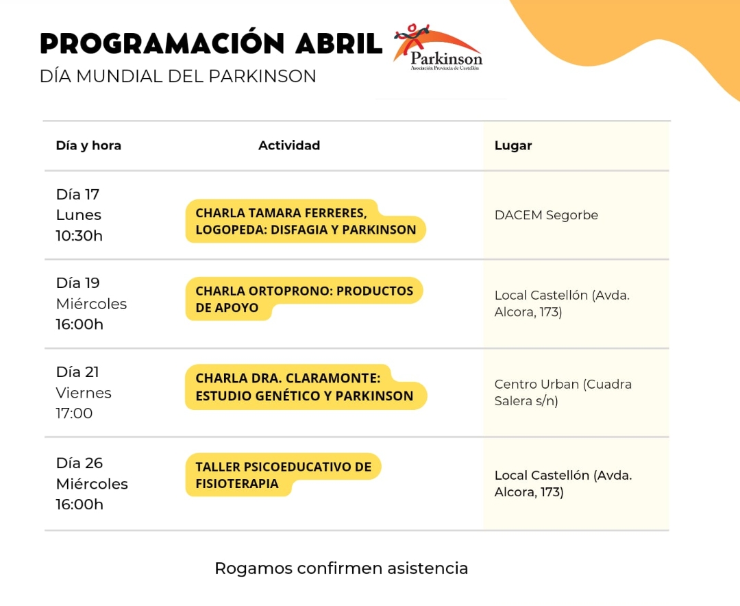 La Asociación de Parkinson participará con la colocación de un stand para proporcionar información sobre la enfermedad y nuestras actividades de 10 a 13.30h