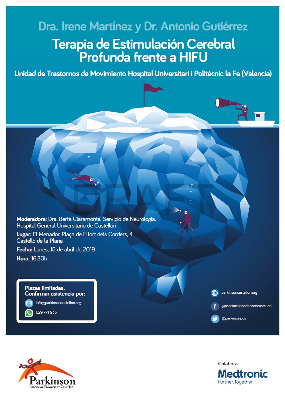 El próximo lunes 15 de abril, la Dra. Irene Martínez y Dr. Antonio Gutiérrez, de la Unidad de Trastornos de Movimiento Hospital Universitari i Politécnic la Fe (Valencia), ofrecerán una conferencia sobre las diferencias entre la intervención de estimulación Cerebral Profunda y el HIFU aplicadas a la Enfermedad de Parkinson.