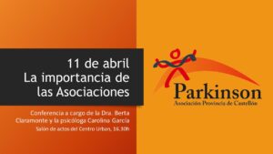 El próximo día 11 de abril, Día Mundial del Parkinson, tendrá lugar la Conferencia "La importancia de las Asociaciones" a cargo de la Dra. Berta Claramonte y la psicóloga Carolina García, en el salón de actos del Centro Urban, a las 16.30h